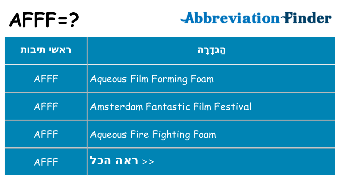 כפי שצוין לעיל, תוכלו לראות את כל המשמעויות של AFFF בטבלה הבאה. לידיעתך, כל ההגדרות מפורטות בסדר אלפביתי.תוכל ללחוץ על קישורים מימין כדי לראות מידע מפורט על כל הגדרה, כולל הגדרות באנגלית ובשפה המקומית שלך.AFFF כראשי תיבות