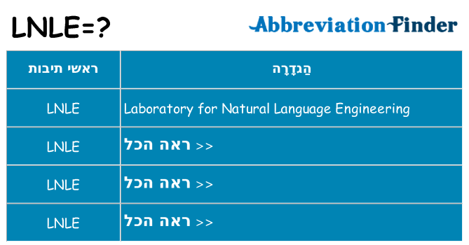כפי שצוין לעיל, תוכלו לראות את כל המשמעויות של LNLE בטבלה הבאה. לידיעתך, כל ההגדרות מפורטות בסדר אלפביתי.תוכל ללחוץ על קישורים מימין כדי לראות מידע מפורט על כל הגדרה, כולל הגדרות באנגלית ובשפה המקומית שלך.