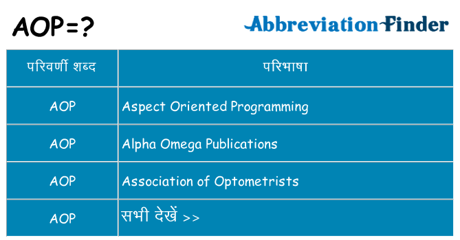 जैसा कि ऊपर उल्लेख किया गया है, आप निम्न तालिका में AOP के सभी अर्थ देखेंगे। कृपया जान लें कि सभी परिभाषाएँ वर्णानुक्रम में सूचीबद्ध हैं।आप अंग्रेजी और आपकी स्थानीय भाषा में परिभाषा सहित प्रत्येक परिभाषा की विस्तृत जानकारी देखने के लिए दाईं ओर लिंक पर क्लिक कर सकते हैं।AOP एक संक्षिप्त नाम के रूप में