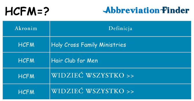 Co oznacza HCFM? Ta strona dotyczy różnych możliwych znaczeń skrótu, akronimu lub slangu. Jeśli uważasz, że te informacje są przydatne lub interesujące, podziel się nimi na swoich ulubionych platformach społecznościowych.