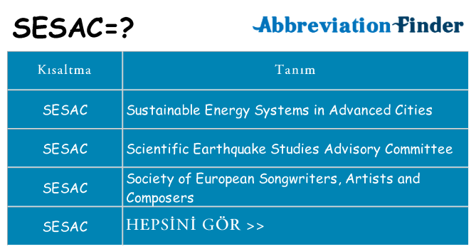 Yukarıda bahsedildiği gibi, aşağıdaki tabloda SESAC'nin tüm anlamlarını göreceksiniz. Lütfen tüm tanımların alfabetik olarak sıralandığını bilin.Her bir tanımın İngilizce ve yerel dilde tanımları da dahil olmak üzere ayrıntılı bilgilerini görmek için sağdaki bağlantıları tıklayabilirsiniz.Kısaltma olarak SESAC