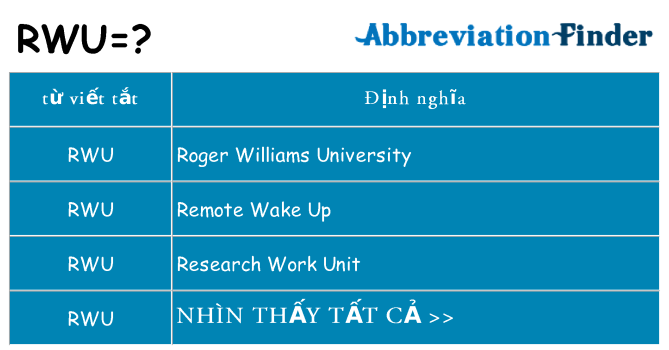 Như đã đề cập ở trên, bạn sẽ thấy tất cả các ý nghĩa của RWU trong bảng sau. Xin biết rằng tất cả các định nghĩa được liệt kê theo thứ tự bảng chữ cái.Bạn có thể nhấp vào liên kết ở bên phải để xem thông tin chi tiết của từng định nghĩa, bao gồm các định nghĩa bằng tiếng Anh và ngôn ngữ địa phương của bạn.